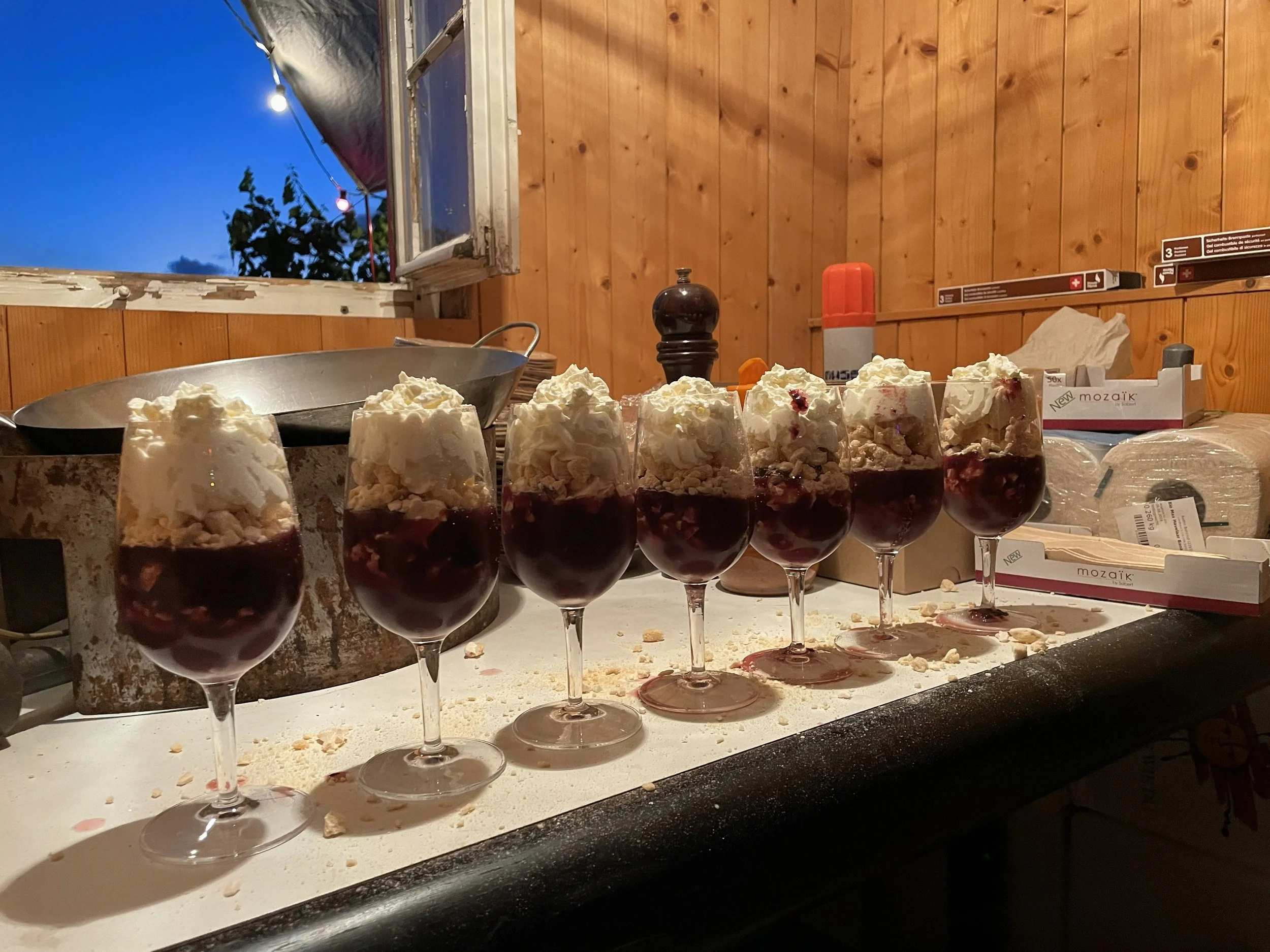 Zum dritten Mal empfangen wir die Gäste zu einem Glas Wein oder auch zu einem frischgezapftem Bier. Dazu servieren wir einen Coq au Vin mit Baguette und zum Dessert - bereits legendär - Traubenglace mit Meringue im Glas.