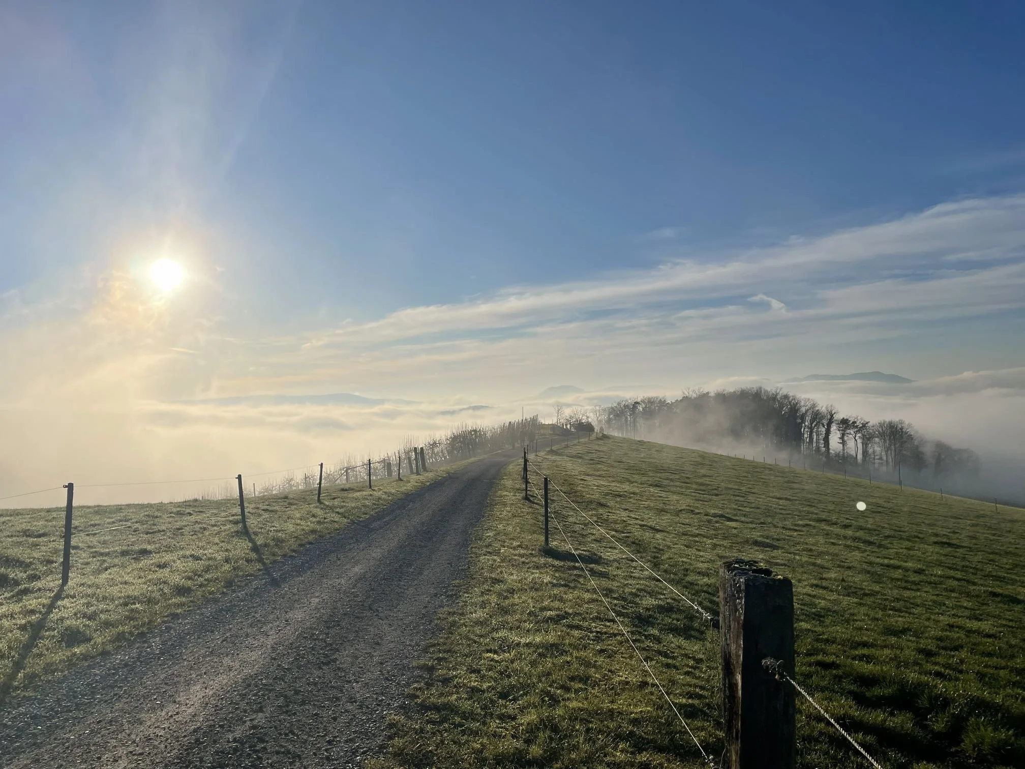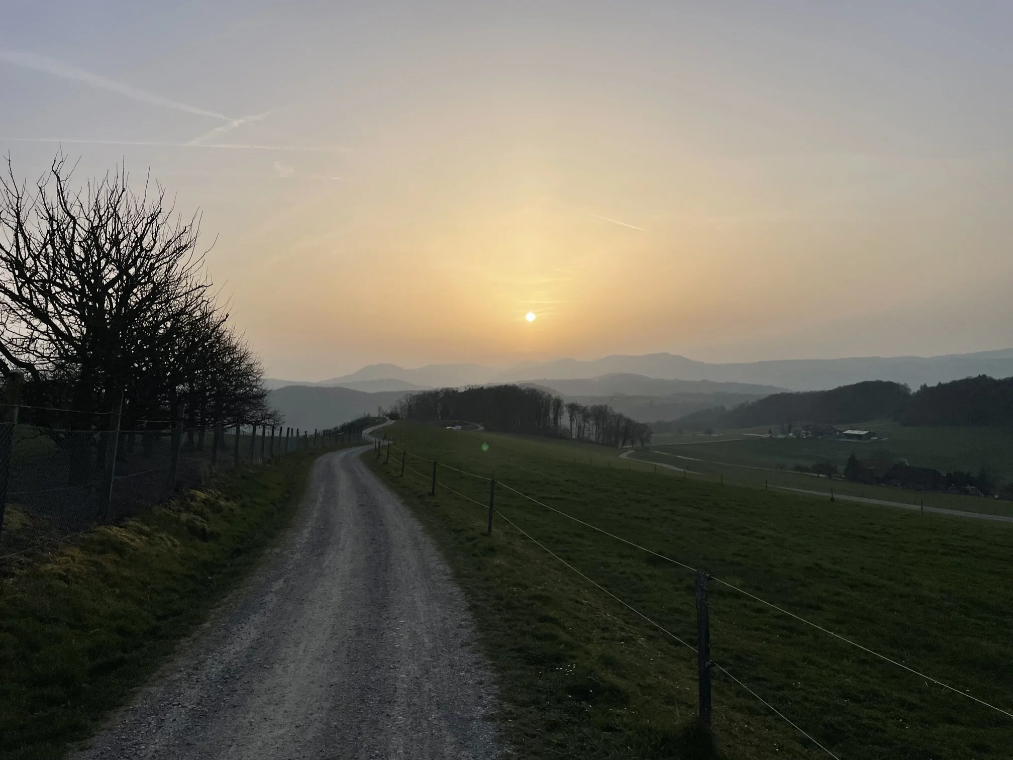 Der schönste Zugang zum Birmenstorfer Rebberg ist der Weg von der Baldegg her über den Petersberg. Vorbei an der Apfelplantage auf der rechten Seite und den Zwetschgenbäumen auf der Linken, wird der Blick frei über die Kante des Rebbergs hinaus in den Jura Richtung Westen. Jeder Moment scheint einzigartig.